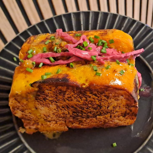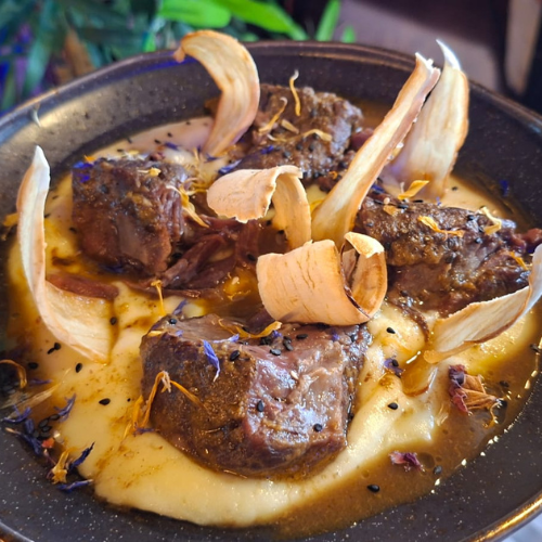 - Carrillera de cerdo sobre parmentier de patata y boniato, con láminas de yuca crujientes19,00